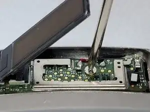 Экран частично прикреплен к материнской плате с помощью клея, поэтому аккуратно подденьте пинцетом экран полностью, чтобы отсоединить его, затем поднимите его.