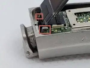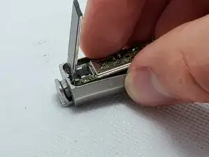 Когда материнская плата будет поднята, используйте пинцет, чтобы отсоединить старый аккумулятор (расположенный в левом нижнем углу) от корпуса. Обратите внимание, что прозрачная желтая часть является частью аккумулятора.