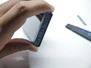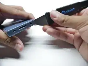 Вставьте лопатку в узкую щель между корпусом и боковой частью нижней крышки, вдоль кромки одной из панелей.