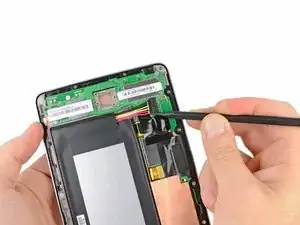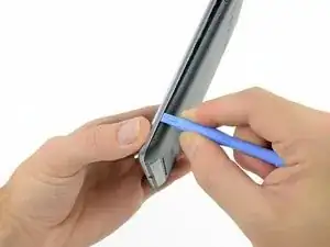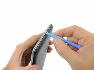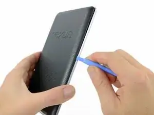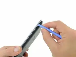 Осторожно вставьте пластиковый инструмент для вскрытия рядом с верхней частью Nexus 7 между задней крышкой и передним модулем.