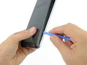 Вставьте пластиковый инструмент для вскрытия между задней крышкой и передним модулем рядом с кнопкой питания и подденьте в нескольких точках вдоль правого края Nexus 7.