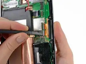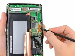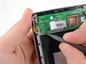 Используйте кончик лопатки, чтобы вытащить ленточный кабель кнопок питания и громкости прямо из его разъёма.