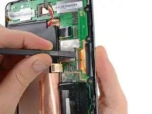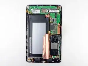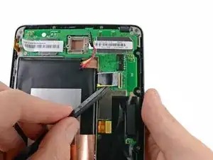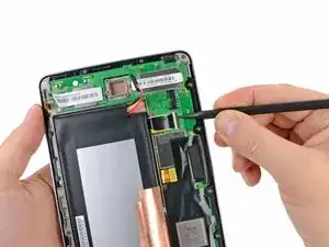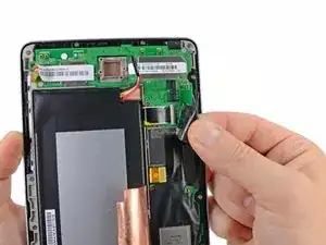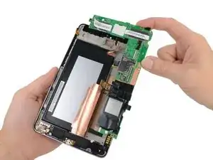 Осторожно поднимите сборку материнской платы из корпуса Nexus 7, следя за тем, чтобы не зацепить кабели.