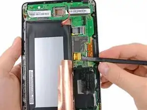 Осторожно проведите пластиковым разъединительным приспособлением вдоль верхнего края, чтобы открыть заднюю панель от передней панели Nexus 7.