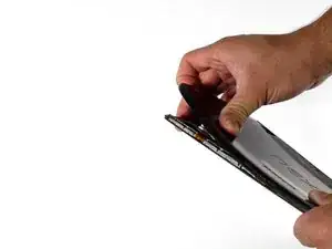 Разделите устройство, вставив пластиковый инструмент в зазор между задней пластиковый крышкой и дисплейным модулем. Используйте инструмент, чтобы отщелкнуть пластиковые защёлки между крышкой и дисплеем.