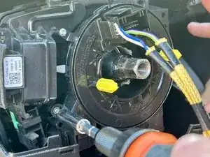 Отверните сломанную спираль подрулевого переключателя, используя отвертку Torx T10, чтобы снять четыре винта, удерживающие её на месте.