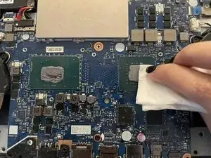 Удалите основную массу старой термопасты салфеткой, смоченной в изопропиловом спирте высокой концентрации.