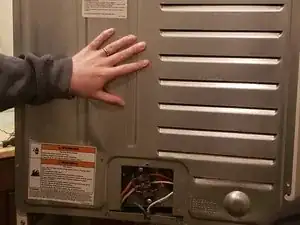 Теперь, когда у нас есть безопасный доступ к задней панели, сначала нужно снять небольшую панель на задней части сушилки. Для этого просто открутите единственный винт в верхней части маленькой панели и поднимите её вверх.