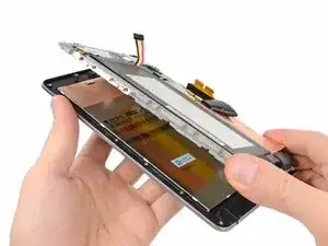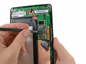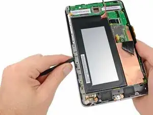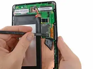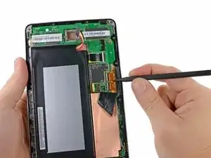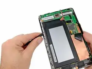 Вставьте пластиковую лопатку с левой стороны Nexus 7, рядом с нижней частью батареи.