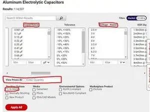 Уточните поиск, введя значения емкости (uF) и напряжения (V) старого конденсатора. Также можно включить фильтр только в наличии.