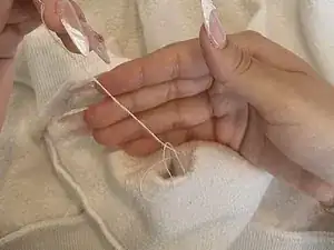 Выверните свитер на лицевую сторону. Потяните за область немного, чтобы убедиться, что стежки держатся и ткань остается целой.