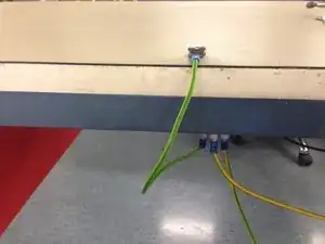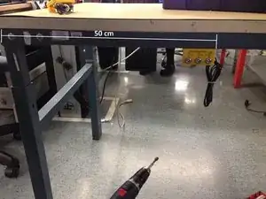 Затем шнур прокладывается прямо к левой задней ножке стола. Изнутри шнур оборачивается вокруг ножки и прокладывается как можно ближе к центру стола.