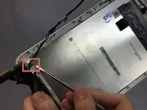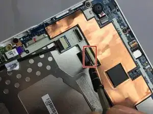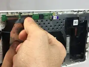 Поднимите фиксирующую планку ленточного кабеля, соединяющего плату экрана с материнской платой, с помощью пластикового инструмента.