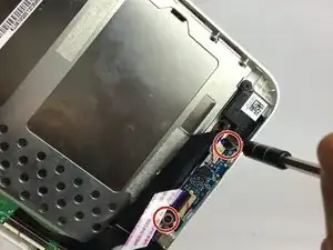 Открутите левый динамик от рамки, отодвинув ленточный кабель в сторону для доступа к винтам с крестообразным шлицем 3 мм.