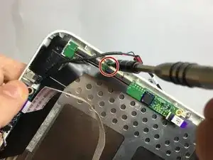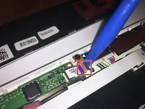 Отсоедините кабель динамика от материнской платы, аккуратно поддев его пластиковым инструментом.