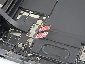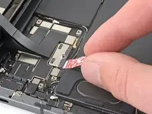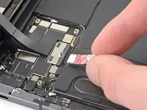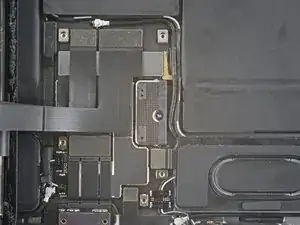 Обратите внимание, что на логической плате у разъема батареи имеются консольные пружины, которые нажимают на контактные площадки батареи. Поскольку и логическая плата, и батарея приклеены, необходимо вставить тонкий гибкий предмет между контактами, чтобы отключить батарею.