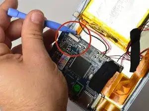 Используя маленький пластиковый инструмент для вскрытия, аккуратно отодвиньте серый разъем назад, чтобы разблокировать гибкий кабель.