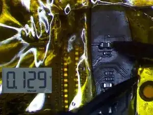 Удалите большие фрагменты припоя оплеткой. Возьмите дроссель с неисправной платы. Припаяйте дроссель феном при 330 °C и потоке воздуха 2. Очистите плату очистителем для печатных плат.