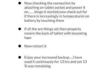 Теперь проверяю соединение, подключая к разъёму планшета и включая питание... вуаля — завелось. Проверьте, не повышается ли температура батарей при прикосновении.