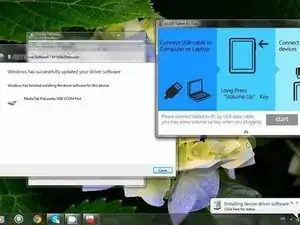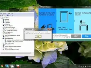 - Удерживая кнопку увеличения громкости, подключите micro USB кабель (уже подключённый к ПК).