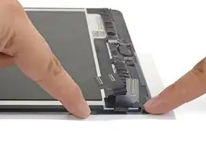 Выровняйте полоску по верхней части дисплейного модуля так, чтобы прямая клеевая линия перекрывала зазор между левой и правой полосками.