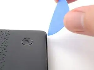 Уголом медиатора направьте его вертикально вниз и вставьте кончик под верхний правый угол задней крышки, рядом с кнопкой питания.