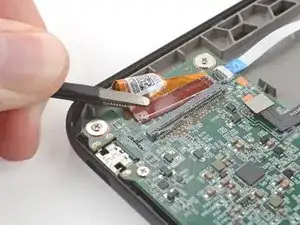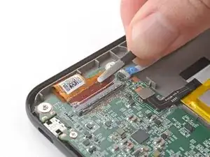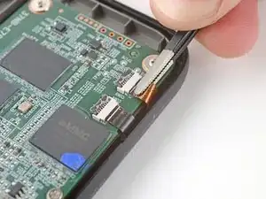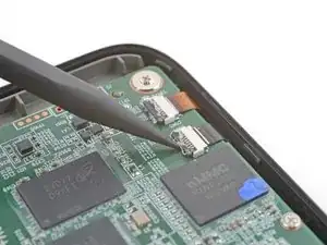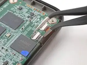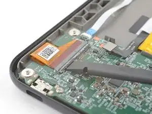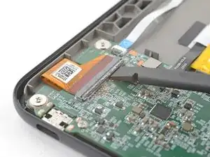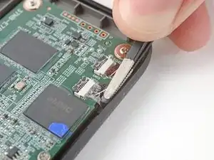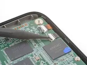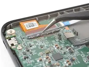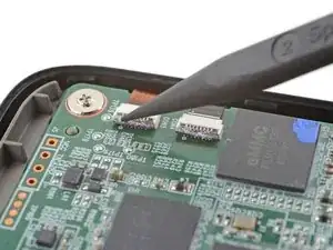 Используйте острые пинцеты, чтобы снять покрытие вокруг чёрных фиксирующих язычков и их петель на ZIF-разъёме.