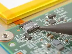 Используйте пинцет с притуплёнными кончиками, чтобы захватить шлейф цифроаналогового преобразователя близко к головке и медленно, равномерно тяните его от разъёма ZIF, чтобы отделить покрытие.