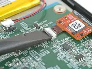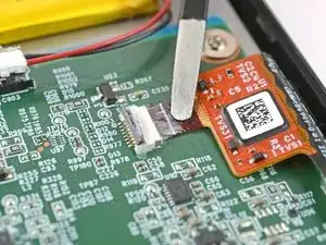 Поднимите кабель дисплея и снимите оставшееся покрытие, удерживающее его на плате.