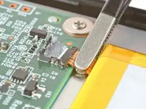 Используйте острый пинцет, чтобы снять всё покрытие вокруг головки разъёма батареи и её гнезда.
