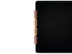 Вдоль левого края экрана есть четыре выреза для гибких кабелей, где клей очень тонкий. Не вставляйте инструмент для вскрытия глубже, чем 2 мм в этих местах, чтобы не повредить дисплей: