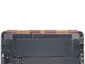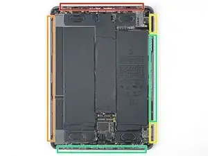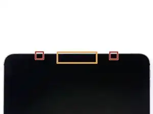 Верхний край iPad содержит модуль камеры, два датчика окружающего освещения, датчик приближения и передний микрофон. Эти компоненты хрупкие и легко повредятся, если пластинку для вскрытия вставить слишком глубоко. Разделяйте клей только в отмеченных местах, чтобы избежать повреждений.