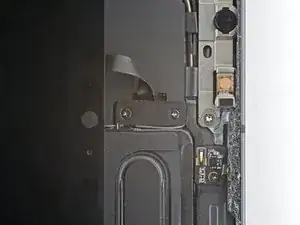 Сдвиньте экран в сторону правого нижнего угла рамы, пока не обнажится шлейф датчика окружающего освещения у верхнего края.