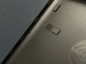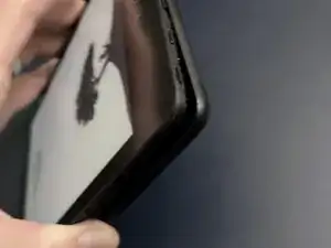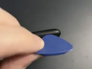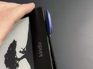 Используя инструмент для поддевания в форме медиатора и/или чёрный лопаточный инструмент, начните с одного из углов, чтобы ослабить заднюю крышку от дисплея. Как только угол освободится, Вы сможете отодвинуть крышку и переместить медиатор к следующему углу.