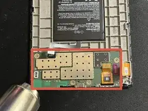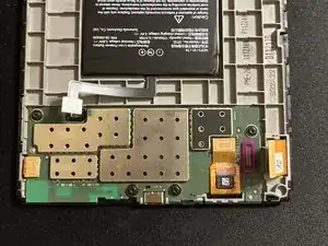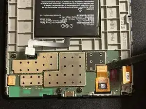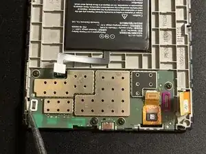 После прогрева кромок и клея начните поддевать нижний угол, зафиксировав устройство в устойчивом положении. Не спешите и при необходимости повторно прогревайте. Используйте тонкие, как можно более тонкие медиаторы, чтобы постепенно ослабить по краям, избегая повреждения платы. Обратите внимание, что плату следует поднимать сверху, так как к ней всё ещё подключён один кабель.
