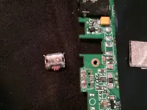 Снимите четыре маленьких винта с крестообразным шлицем на нижнем краю платы. Поднимите плату сверху и выньте её вверх и наружу. С этого момента можно ремонтировать разъём micro USB. Это потребует микропайки. Если Вы не умеете паять, найдите специалиста.