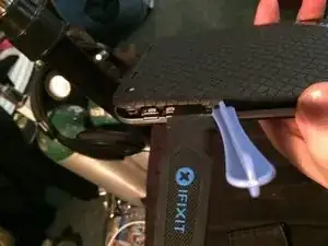 Осторожно подденьте заднюю крышку рядом с кнопками громкости лишь настолько, чтобы вставить клин или медиатор под кнопки и снять с них напряжение. (они болтаются и могут повредить переключатели внутри) Проходите по периметру аккуратно, не вводя инструмент слишком глубоко.