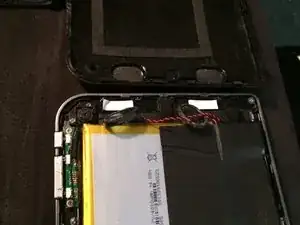 Завершите разъединение возле динамиков — они приклеены к крышке и напрямую припаяны к плате. Поднимите заднюю крышку снизу и отведите её вверх, вытащите динамики из посадочных мест; по краям они закреплены поролоновой лентой. Провода проходят под аккумулятором, пока оставьте их на месте.
