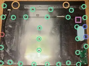 Если вы хотите освободить заевшую кнопку питания, вам не нужно снимать металлическую крышку целиком — достаточно снять только кромку. Для ремонтов, не связанных с кнопкой питания, удалите также металлическую крышку. Следуйте схеме винтов на первой фотографии, чтобы хранить их разделёнными по цвету.