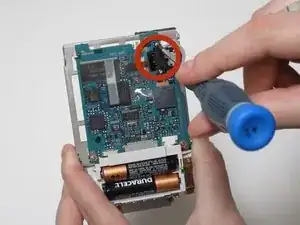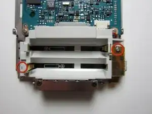 С помощью отвёртки Phillips №0 выкрутите два винта в нижних боковых частях Sony Clie, чтобы снять держатель батареи.
