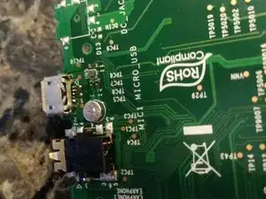 Присоедините новый микроконтактор Micro USB. Сначала полезно очистить область флюсом и удалить старый припой с дорожек. Вам нужно осторожно согнуть контакты нового разъема к плате, а также заранее подпаять их и дорожки платы. Вставьте его на место, затем прогрейте контакты разъема (не монтажные стойки), чтобы зафиксировать его.