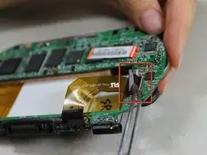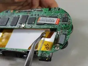 Отсоедините 2 конца коричневой ленты с проводами слева от посадочного места аккумулятора на материнской плате с помощью пинцета.