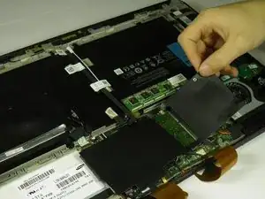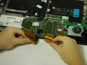 Используйте наклонный край инструмента для открывания, чтобы поднять зажимы, фиксирующие кабели экрана и материнской платы.
