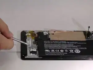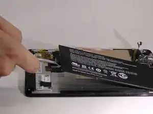 Осторожно отогните чёрную ленту, закрывающую разъём кабеля аккумулятора.