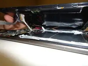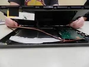 После отделения экрана от задней панели вы увидите два кабеля, соединяющие экран с внутренностями планшета (один серебристый, один чёрный).