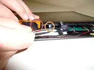 Снимите серебристый кабель, удалив ленту, соединяющую кабель и экран. Аккуратно отсоедините золотой кабель от гнезда.