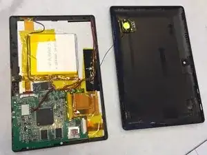 Аккумулятор будет виден, как на изображении. Отделите заднюю крышку от устройства. Избегайте повреждения провода, соединяющего динамики между двумя половинами корпуса.