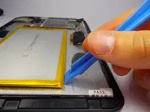 С помощью пластикового инструмента аккуратно подденьте края аккумулятора с обратной стороны сенсорного экрана. Начните с конца аккумулятора, противоположного соединительным проводам.