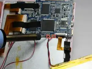 Используя паяльник, отпаяйте оба провода аккумулятора. Провода аккумулятора расположены слева от шлейфа камеры.