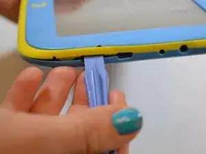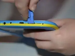 Используйте пластиковый инструмент для открытия, чтобы отстегнуть переднюю пластиковую панель от задней пластиковый панели. Используйте слот microSD для первоначального начала отвелки.